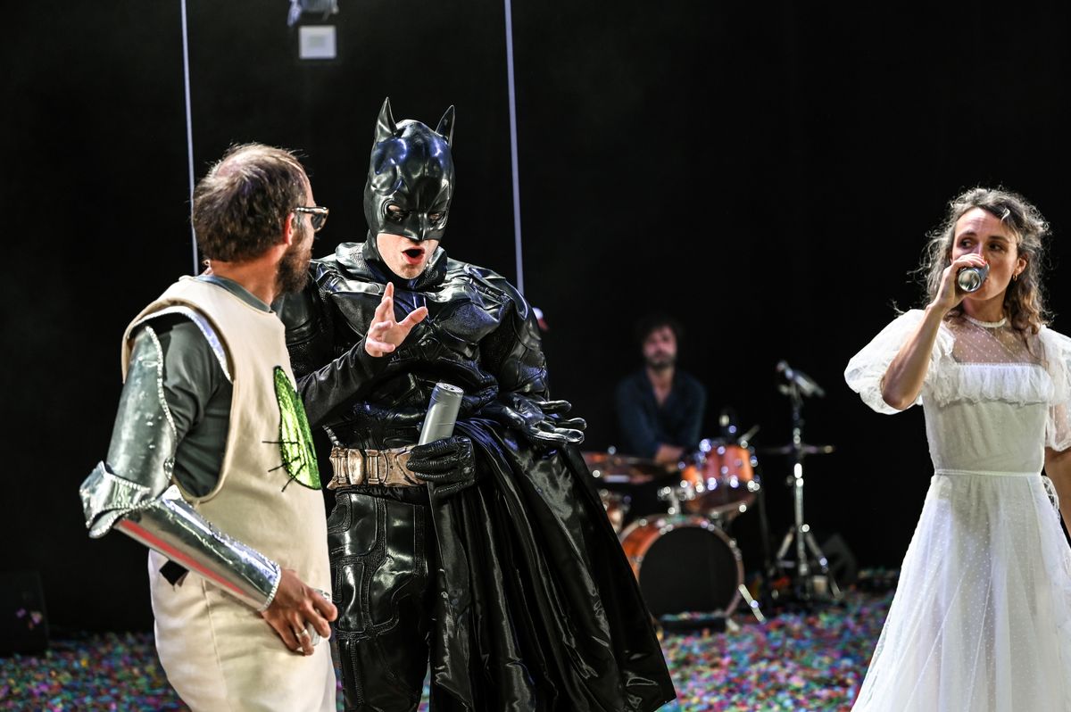 Anfangs durchschaut das Publikum die Lage nicht. Es sieht eine Frau hereinkommen, der eine Axt im Hirn steckt, und einen Mann, über dessen Kopf ein Blecheimer gestülpt ist. In Kontrast zum befremdenden Äusseren steht der Dialog. Er bringt das wohlbekannte Gekeif angejahrter Eheleute. Spannung entsteht dadurch, dass ein zweites Paar auftaucht. Der Mann steckt im Batman-Kostüm, die Frau trägt das ihre zusammengefaltet im Arm. Das neue Paar will das Haus des alten kaufen. Damit beginnen sich die Fäden in Vergangenheit und Zukunft zu erstrecken.