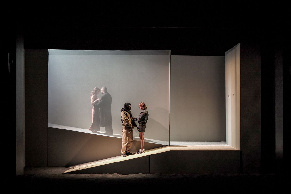 Er entfaltet sich im klugen – und klug bespielten – minimalistischen Bühnenbild von Margaux Nessi: Zwei Podien, zwei Rampen, eine Vorbühne, zwei Gazevorhänge. Hier ruft Sébian Falk-Lemarchand mit wechselnden Lichtern unterschiedliche Atmosphären und Raumeindrücke hervor. Und Samuel Robineaus Klangeinrichtung verbindet die Szenen dergestalt, dass sie sich zur Geschichte gestalten.