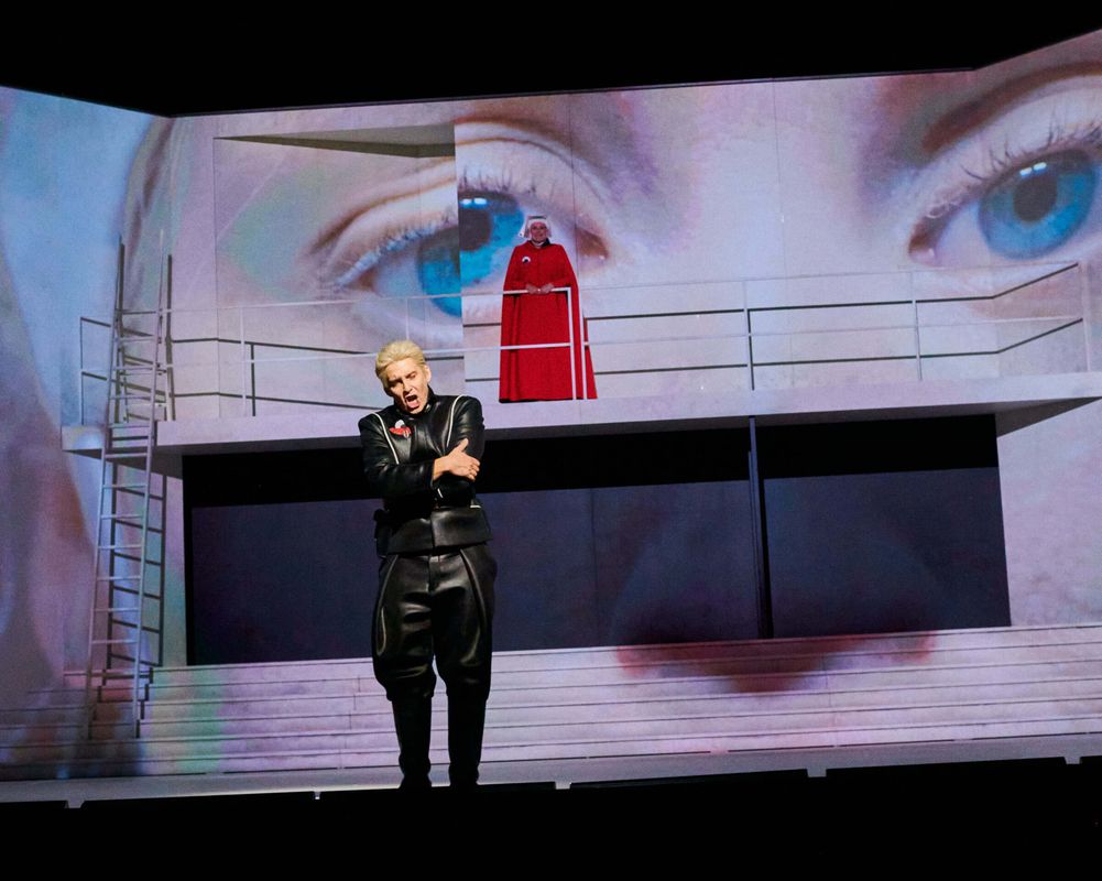 Im ersten Akt erfährt sie die gewaltgeprägte Umwelt als albtraumhafte Zwangsgesellschaft. Gleichgeschaltet marschieren die Frauen in roter, streng beengender Nonnentracht auf, und die Männer uniformiert in schwarzem, ledernem Militärtenue. Im zweiten Akt behandelt der Grosssteuereinnehmer Géronte de Ravoir in seinem Palast Manon als Sexpuppe.