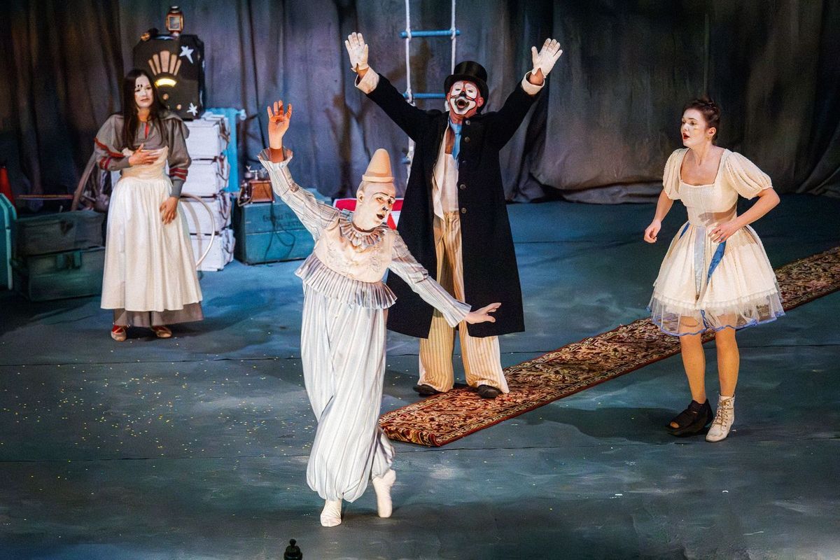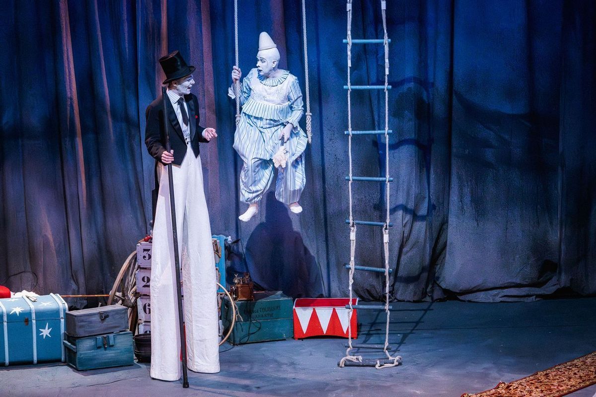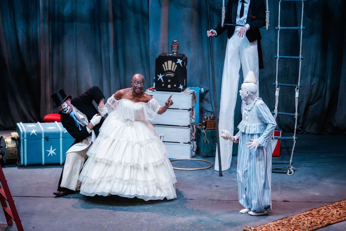 Diesen Verlauf, wiedergegeben von unzähligen Totentänzen, allen Sterblichen bekannt, stellt Jean Lambert-wild mit seiner Coopérative 326 in eine Zirkusdekoration. Das Stück verlangt's zwar nicht, aber in diesem Milieu kennt er sich aus. Er ist von Berufs wegen ein weisser Clown, und die übrigen sind Artisten. Ein schwarz-weiss gesprenkeltes Hausschwein rollt den roten Teppich aus. Der Darsteller des Leibarzts bewegt sich auf Stelzen.