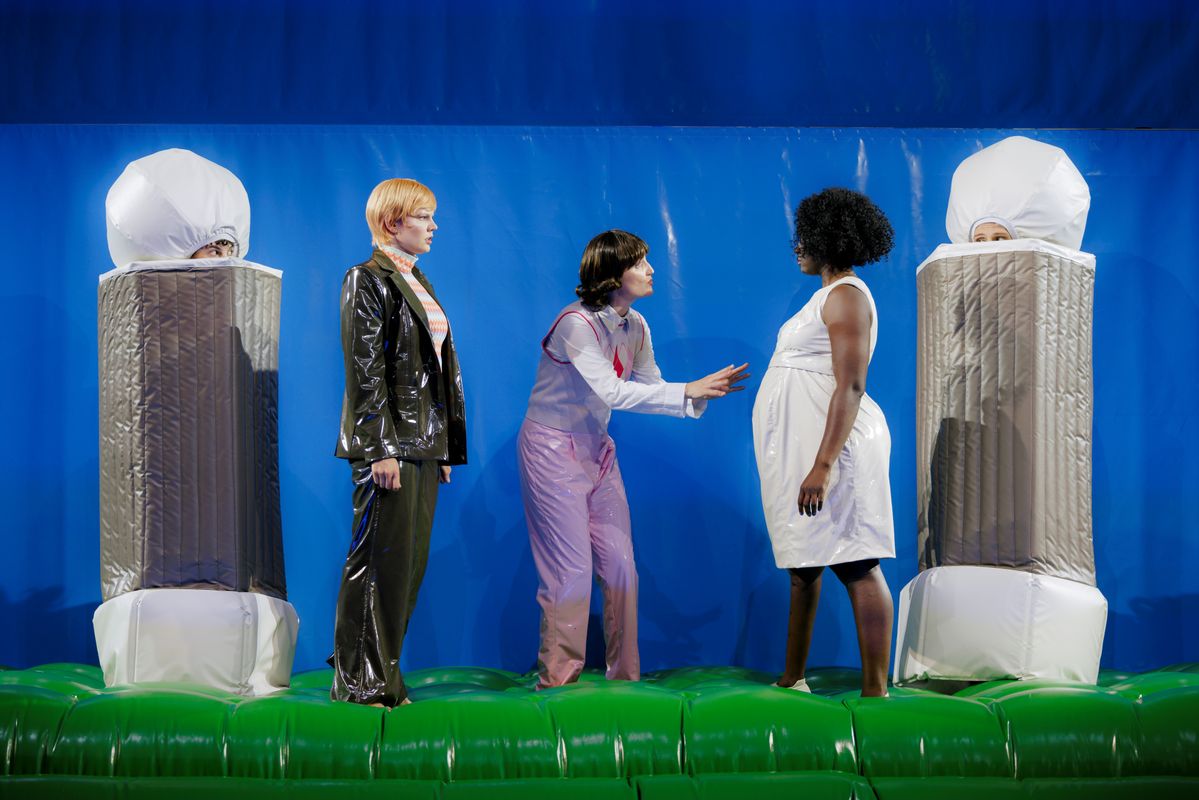 Die Infantilität der heutigen Debatte gibt das Bühnenbild von Sophie Lux eindrücklich wieder. In den Plastikkostümen von Moana Stemberger bewegen sich die Schauspieler in einer riesigen Hüpfburg. Die jungen Zuschauer im Wiener Volkstheater sind ihr kaum entwachsen, und die Elternpaare auf der Bühne leben noch darin (nicht nur inszenatorisch, sondern auch entwicklungspsychologisch). Damit fallen bei "The Boys Are Kissing" Tonart und Ausstattung zusammen. Ein Treffer.