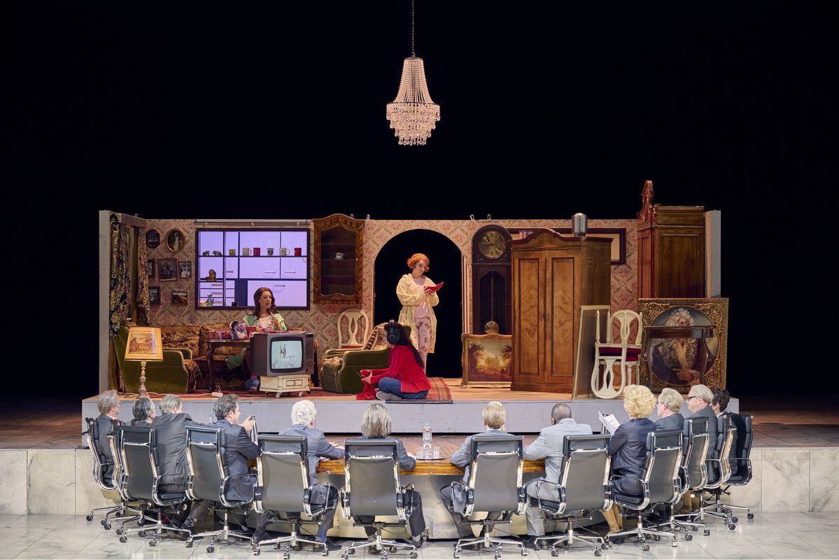 Die Aufführung beginnt an einem grossen, vornehmen Aufsichtsratstisch. Hier waltet die Vorsehung, verkörpert durch die Charakterköpfe des Herrenchors. Auf erhöhter Ebene läuft die eigentliche Oper ab. Da müssen sich die Guten verstellen: Angelina spielt, um nicht verstossen zu werden, eine Hausmagd; der Prinzenerzieher Alidoro spielt, um den Verlauf zu steuern, einen Bettler und einen Priester; und der Prinz spielt, um den Charakter der Bewerberinnen zu erforschen, einen Diener.