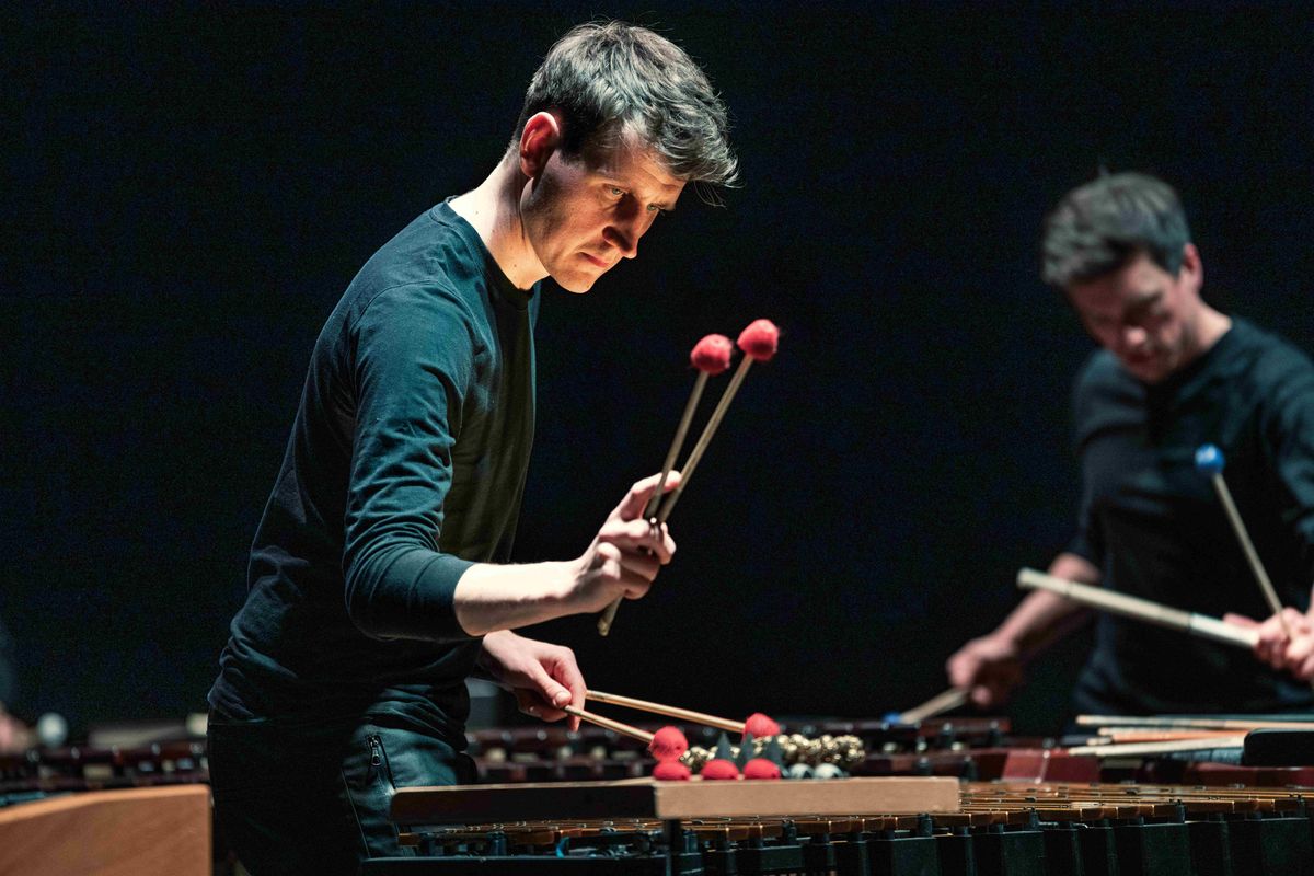 Mit geschlossenen Augen sehe ich die Störung nicht mehr. Aber auch nicht, wie sich die vier schwarzgewandeten Musiker durch die Landschaft bewegen. Die Bühne ist ja vollgestellt mit Perkussionsinstrumenten aller Art – aus Holz, Metall, Stein, Glas und Fell. Man kann mit ihnen nach dem Lehrbuch umgehen – links, rechts, links, rechts ... links, links, rechts, rechts – doch man kann auch frei mit Stöcken und Fingern auf Kanten und Schallkörper schlagen (Alexeji Gerassimez: Asventuras).